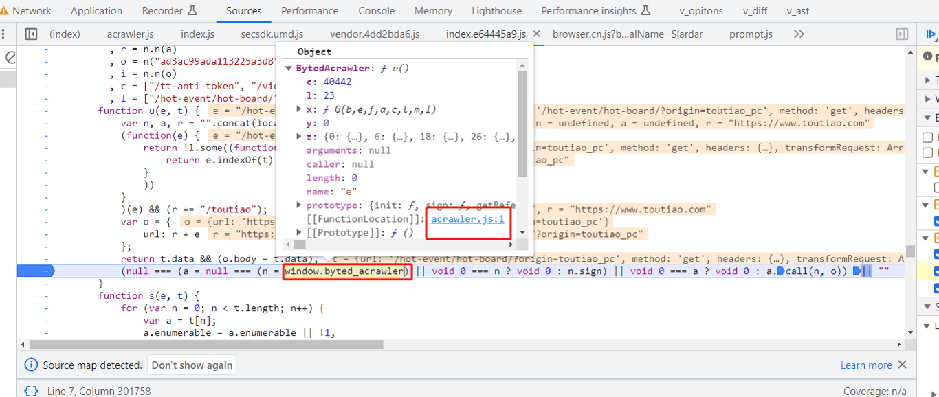 方法1:文件鼠标悬停到window.byted_acrawler上,点开prototype