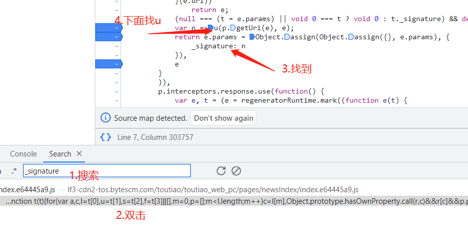 可以看到_signature=n,而n是一个u函数获取的,需要进入u函数查看,在var n=u(p.getUri(e),e);处打断点。